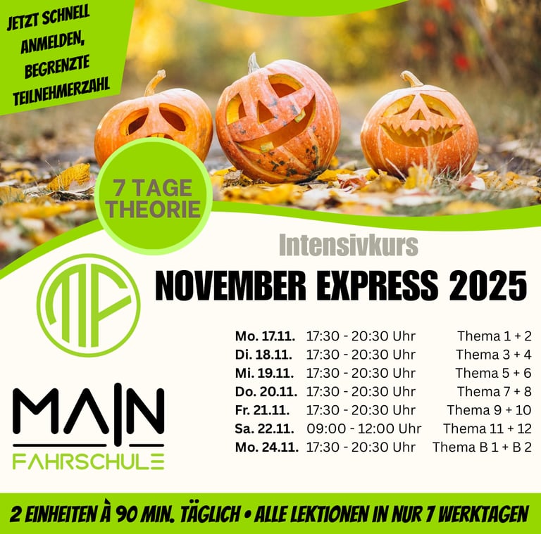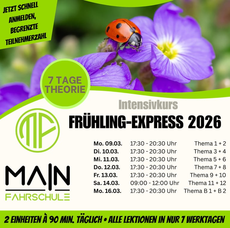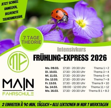 Du hast keine Lust jede Woche ein bis zwei mal in die Theoriestunden zu gehen, und vielleicht wiederholt die gleiche Lektion zu hören? dann bist du bei uns genau richtig. Wir bieten in regelmäßigen Abständen theorie Blockunterrichte an. Mit uns schaffst du alle Lektionen in nur 7 Werktagen.