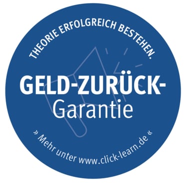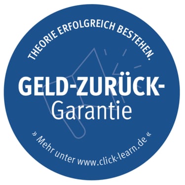 Durchgefallen? Dann zahlt sich dein Kauf vom CLICK & LEARN 360° online Premium-Set TROTZDEM aus, denn Dank unserer Geld-zurück-Garantie erstatten wir dir Deine theoretische Prüfungsgebühr (TÜV / DEKRA) in Höhe von 24,99 Euro zurück! Und das ganze als Direktüberweisung auf dein Konto!
